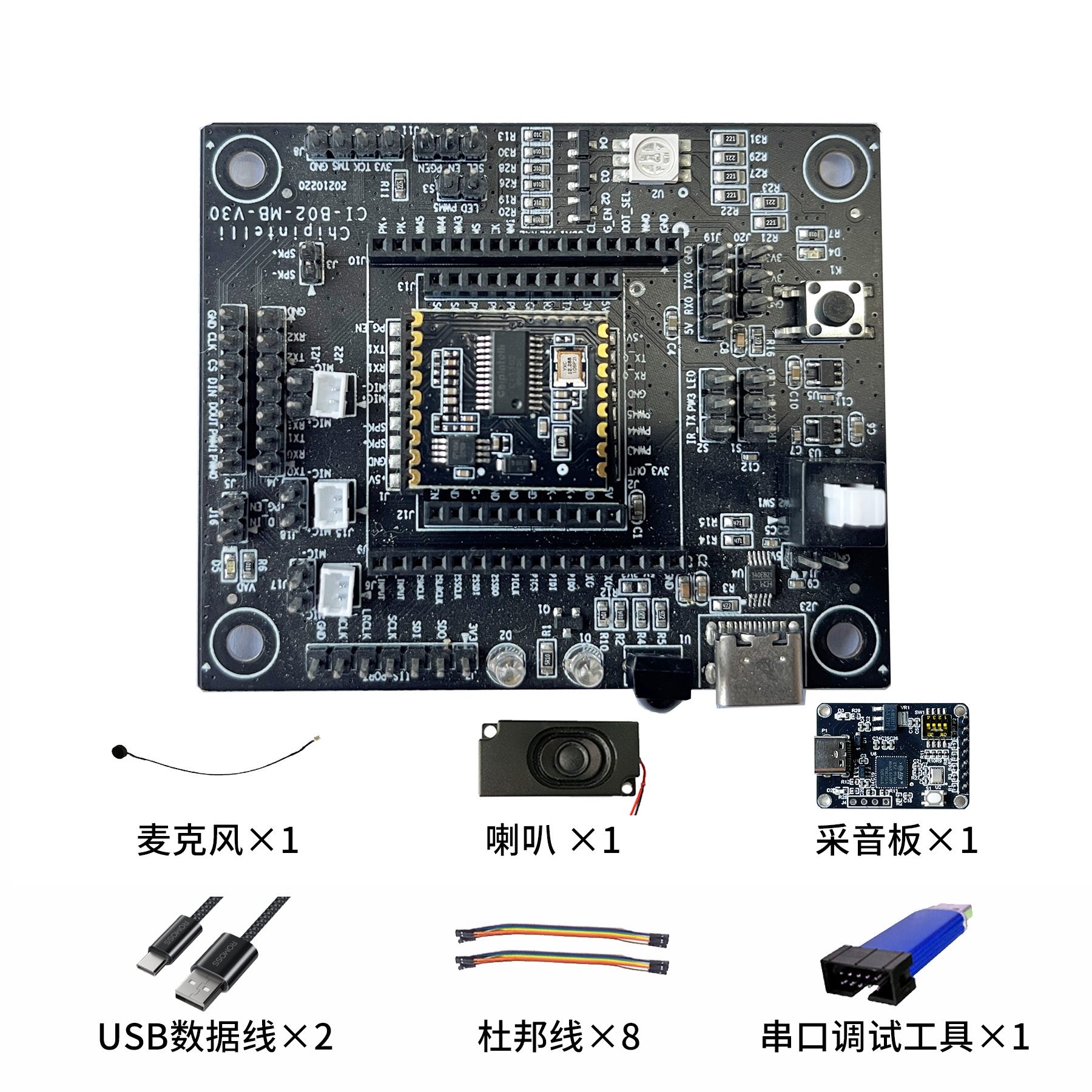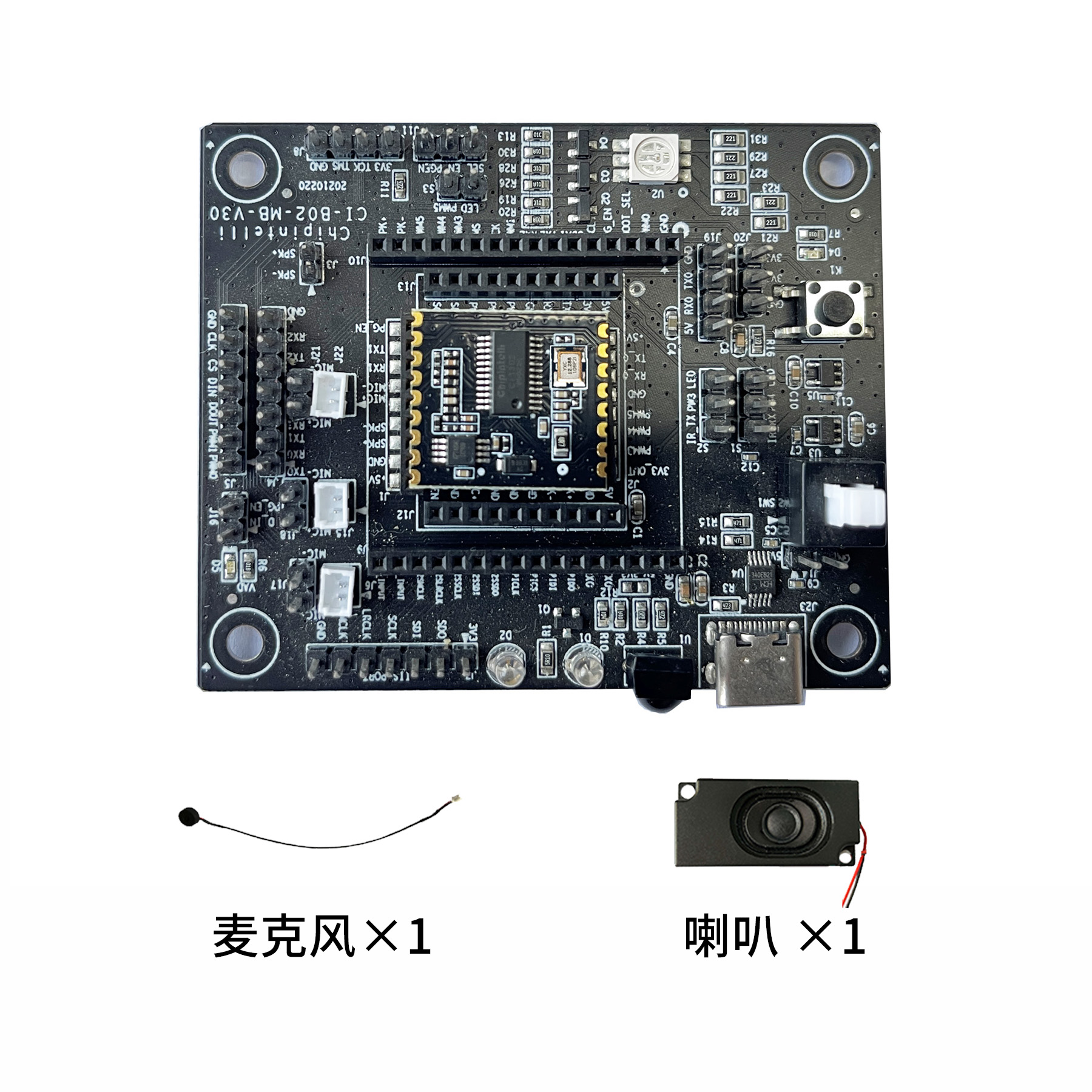 CI1302开发板套件可用于CI1302芯片的开发调试。通过该底板,可实现所配套语音模块的外接和扩展应用,以及用户开发固件的设计验证。【产品组件】